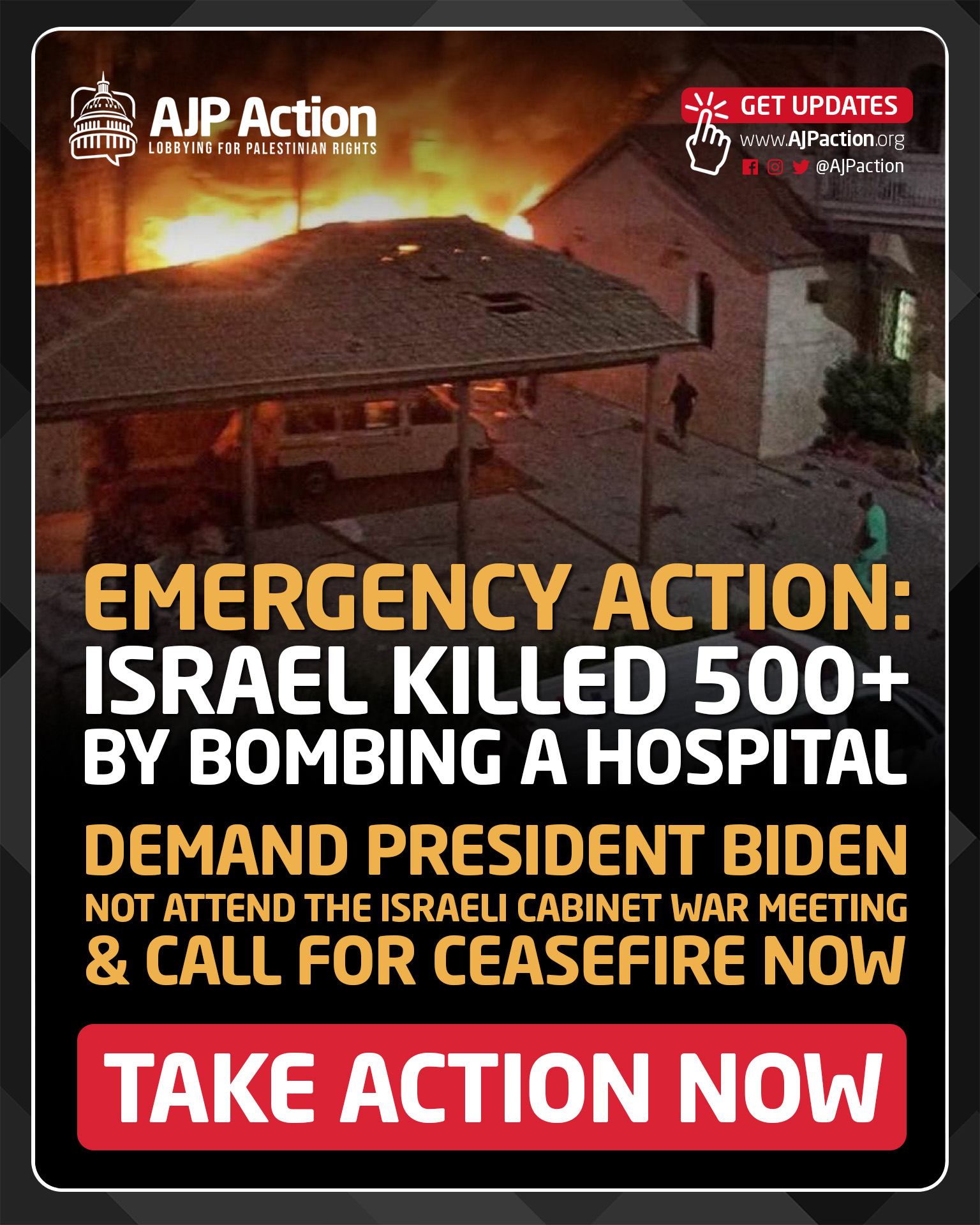 Demand President Biden not attend the Israeli Cabinet War Meeting & Call for Ceasefire Now Dear Friend, Over 500 Palestinians were just killed in an Israeli strike on a hospital in Gaza. While we're watching Israel bring its genocidal rhetoric into action, President Biden will attend an Israeli war cabinet meeting in Jerusalem. The Biden Administration's actions are putting the U.S. at risk of being implicated in war crimes. While many leaders in Congress are calling for an immediate ceasefire, Secretary of State Antony Blinken has attended an Israeli war cabinet meeting. Now, President Biden will also do so tomorrow. This is shameful and implicates the United States in any war crimes discussed or planned during these meetings. Additional actions: - Action 1: Tell your Representatives to Cosponsor H.Res.786, which demands an immediate ceasefire