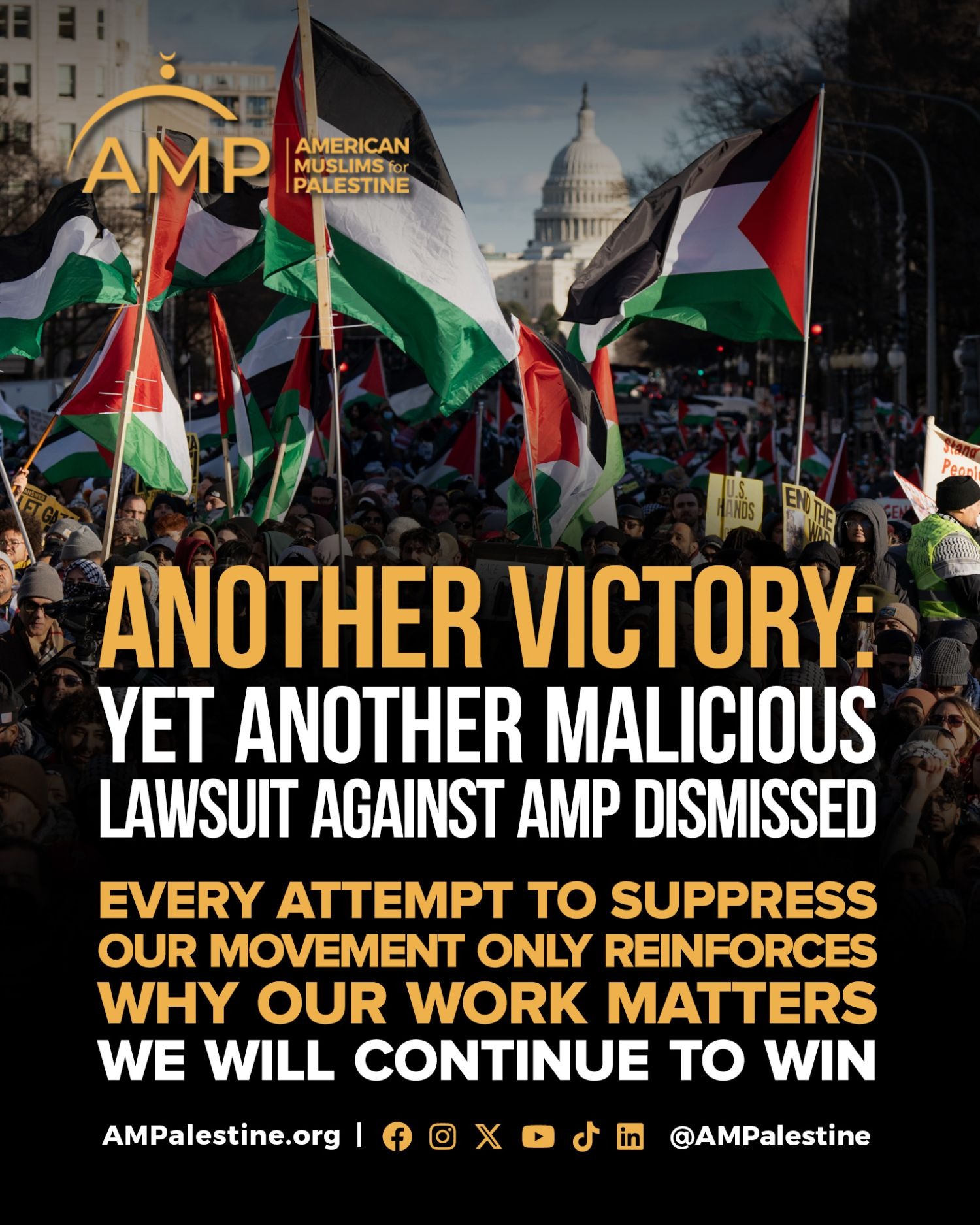 Every attempt to suppress our movement only reinforces why our work matters. We will continue to win. Dear Supporter, After nearly two years of relentless attacks, justice has prevailed, yet again. On February 24th, a federal court in Florida dismissed all claims against American Muslims for Palestine and many of its leaders. We proudly celebrate this victory and the clear affirmation that our advocacy is lawful, protected, and rooted in fundamental constitutional rights. We are deeply grateful to our extraordinary legal team, Christina Jump of Jump Start Legal Justice Center, along with Samira E. and Ali Boyd of the Muslim Legal Fund of America (MLFA). The MLFA has represented AMP for many years and has assembled an outstanding team of attorneys under the leadership of Ms. Jump, for which we remain profoundly grateful. We deeply appreciate their continued dedication and professionalism as the team continues under Jump Start Legal Justice Center. With this highly qualified and capable legal team, AMP has successfully defeated four frivolous and malicious federal lawsuits to date. They tried to come after us for using our constitutionally protected rights. They attempted to drain our resources, to weigh us down. To intimidate us into silencing our advocacy. They tried to weaponize the legal system to chill constitutionally protected speech. They tried to make an example out of us. But they failed, and anyone else who believes they can weaponize the courts to intimidate or silence us will fail too. The law is not a tool for repression, and our commitment to justice cannot be litigated away. The truth does not disappear because it is inconvenient to the oppressor's agenda. No matter how persistent the oppressor, no matter how coordinated the intimidation, truth endures. βWhat the plaintiffs offered were merely allegations built on falsehoods, selective inferences, and layers of manipulation and distortion. We know that our opponents are attempting to silence our voice through intimidation and frivolous lawsuits. But they forget that we have a Constitution, the rule of law, and an independent judiciary in the United States,β said Dr. Osama Abu Irshaid, Executive Director of American Muslims for Palestine (AMP). βAt AMP, we reaffirm that we will never relinquish our constitutional rights under any form of pressure or unlawful intimidation. We remain more determined than ever to defend all those who face injusticeβforemost among them, the Palestinian people.β AMP's lead counsel, Christina Jump, said: "These plaintiffs, like others before them, used vague and broad offensive language. They equated support for Palestinians with support for illegal activities. But the law never intended that, and the courts require more. AMP won this lawsuit, just like it won several others in the past few months. We'll keep fighting for what's right, and we'll keep celebrating when AMP wins." To those who believe they can exhaust us into silence, understand this: every attempt to suppress our movement only reinforces why our work matters. Every failed lawsuit exposes the weakness of their claims. And every victory strengthens our resolve. We will not be intimidated. We will not be silenced. And we will continue to advocate, unapologetically and lawfully, for justice, freedom, and dignity for the Palestinian people. In solidarity, American Muslims for Palestine (AMP) |