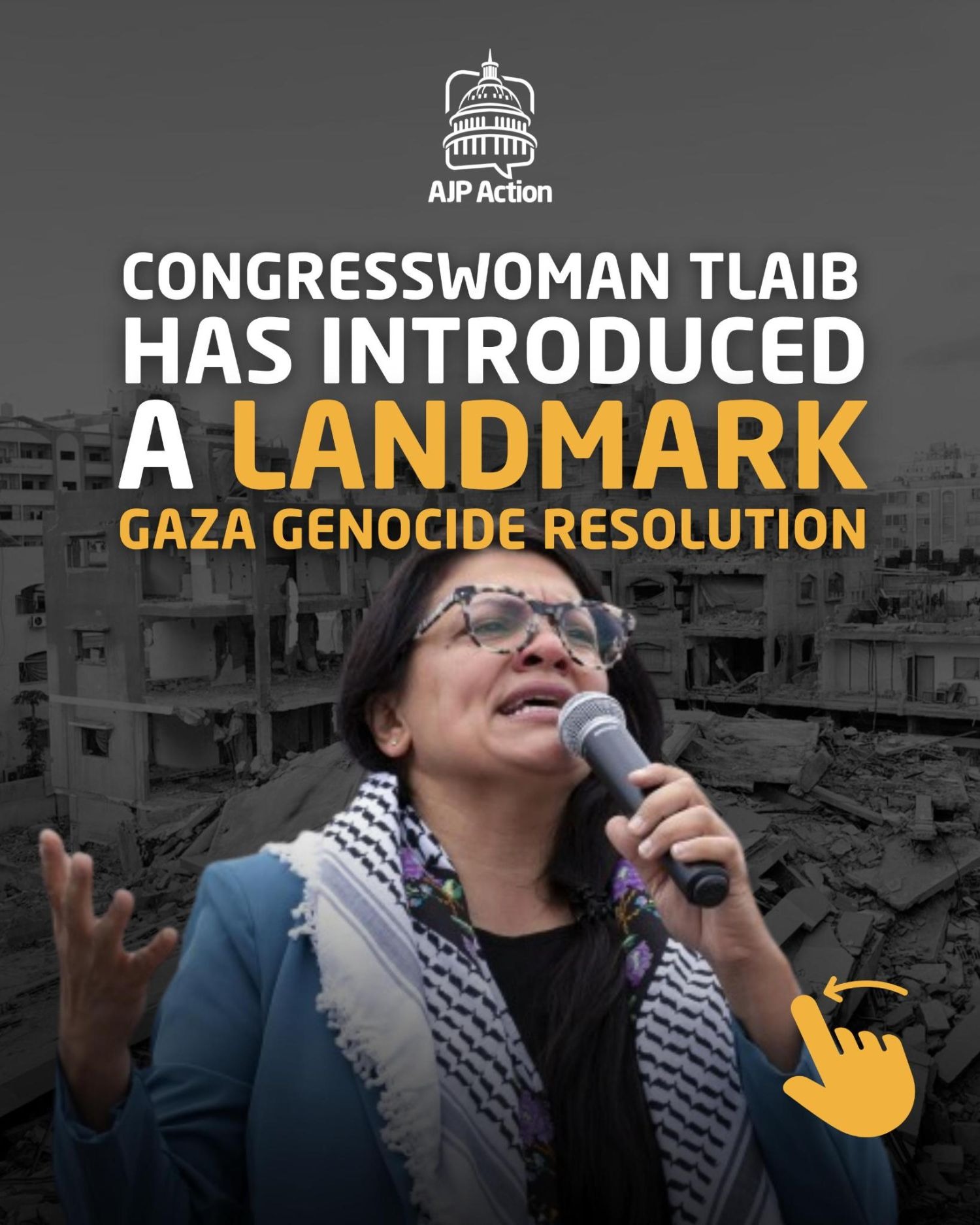 Congresswoman Tlaibβs genocide resolution forces the U.S. to confront its role in genocide and demands immediate action and accountability Dear Supporter, AJP Action is proud to endorse Congresswoman Rashida Tlaibβs historic resolution, H.Res. 876, which does what our government has shamefully refused to do: formally recognize the Israeli stateβs deliberate and systematic destruction of the Palestinian people in Gaza for what it is. This is not a matter of opinion or political debate. It is a legal and moral fact. The evidence is overwhelming and undeniable: the mass killing of at least 68,000 Palestinians (this number is a conservative estimate) in less than two years, the calculated obliteration of every university and hospital, the weaponization of starvation and manufacturing famine, and the explicit statements of intent by Israeli officials to erase Gaza from existence. This resolution forces Congress to look directly at the monstrous reality it has funded and armed. βAt this very moment, as Israel continues its atrocities under the cover of a false ceasefire, the need for this resolution is more critical than ever. For years, our tax dollars have funded this genocide, and our government's unwavering political and financial endorsement has enabled it. This resolution obliterates any pretense of neutrality. It is a line in the sand. To every member of Congress: you are either with the victims of this slaughter, or you are with the perpetrators. There is no middle ground. History will not forget your vote. History will not forgive your cowardice. The Palestinian people deserve more than our thoughts and prayers; they deserve our immediate and total action to end this nightmare,β said Dr. Osama Abu Irshaid, AJP Actionβs Executive Director. H.Res. 876 does more than just document Israel's atrocities; it forces a reckoning. It demands that the U.S. government stop being complicit and start honoring the Genocide Convention. This means taking concrete, immediate action such as: - An immediate arms embargo: Halting all weapons transfers to Israel.