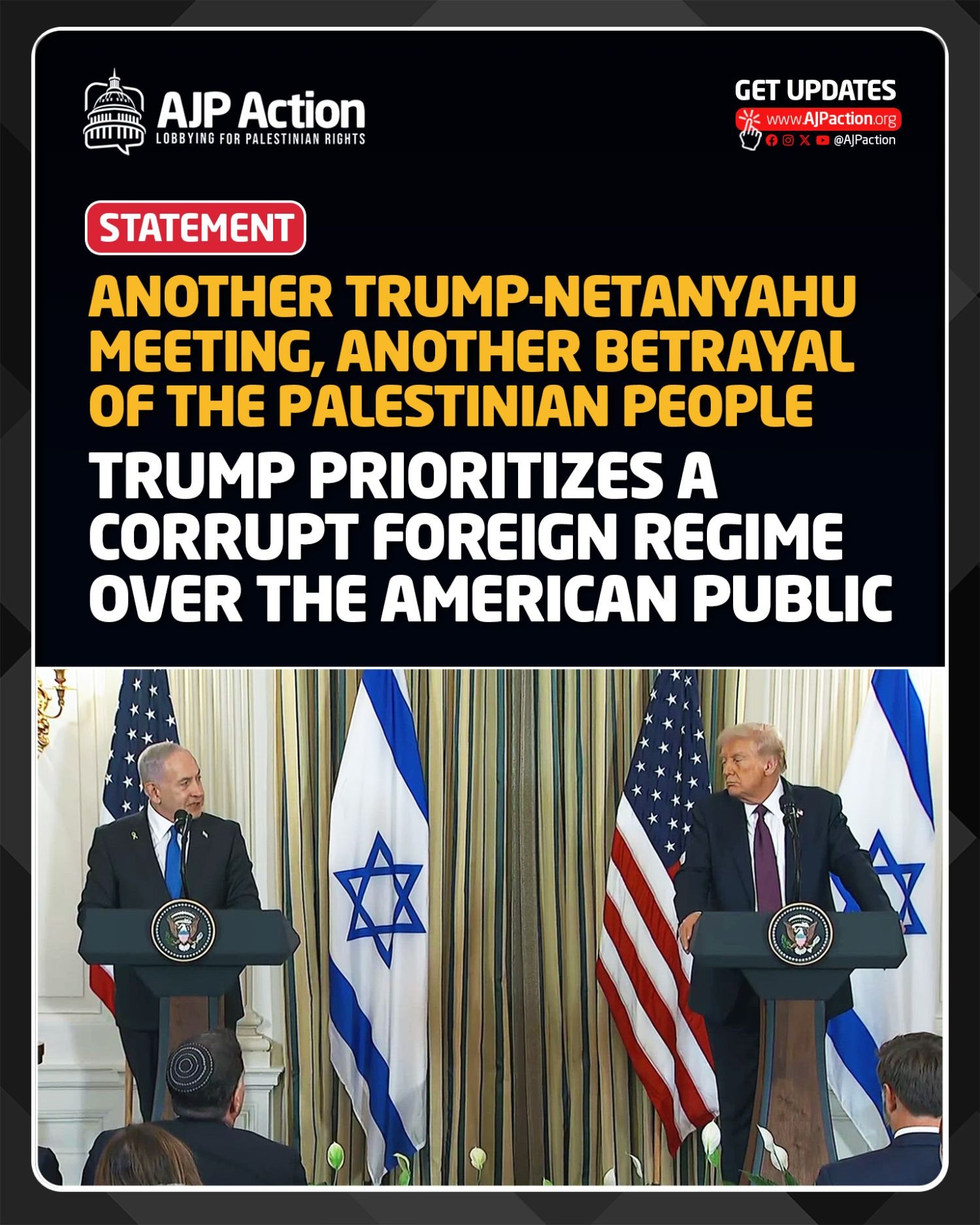 Trump Prioritizes a Corrupt Foreign Regime Over the American Public Dear Supporter, At todayβs joint press conference with Israeli Prime Minister Benjamin Netanyahu, President Trump spoke as though the United States were beholden to Israel rather than the other way around. He seemed to forget that he is the President of the United States, entrusted with safeguarding American interests. His remarks reflected not βAmerica First,β as he claims, but βIsrael First.β Once again, Netanyahu outmaneuvered Trump, manipulating the optics and narrative to his advantage. If Trump genuinely seeks βeternal peaceβ in the Middle East, he must begin by curbing Israelβs recklessness and holding it accountable for its crimes. That includes ending U.S. complicity in Israelβs violations of international law, its destabilizing actions across the region, and the administrationβs financial and political support for Israelβs genocidal war on Gaza. Peace cannot be a reward for criminality. It cannot be built atop Israelβs occupation of Palestine, its repeated assaults on Gaza, the West Bank, Syria, Lebanon, and beyond. True peace demands justice, an end to occupation, aggression, and impunity. While Israeli prisoners receive global attention, thousands of Palestinian detaineesβmany held for decades, including women and childrenβremain invisible. To humanize one side while erasing and enabling the suffering of the other only deepens the imbalance and perpetuates instability. History did not begin on October 7, nor will it end there. The issue is not about security arrangements in Gaza that serve Israelβs interests, but about the root causes: occupation, apartheid, and aggression. It is the Palestinian people who need protection from Israeli apartheid, occupation, and ethnic cleansing, backed by American power. They do not need international guardianship. They need, want, and deserve nothing less than the right to self-determination, exercised freely and without coercion. The United States, Israel, and all governments complicit in the war on Gaza bear moral and legal responsibility to fund its reconstructionβwithout strings, without interference, and without using aid as leverage against the Palestinian people. How can Palestinians trust Trumpβs promises of peace when he speaks of Gazaβs βreal estate valueβ as a strip of land on the sea? Talk of reforming the Palestinian Authority rings hollow when Israelβa state that flouts human values and international lawβis governed by extremists and shielded from accountability. Netanyahu is right about one thing: this is a war between civilization and barbarism. But it is Israel that embodies the latter, as the world has been witnessing in Gaza for two years now. Trump, and the U.S. government as a whole, continues to face a choice: continue enabling this brutality, or finally hold Israel accountable and redirect the administrationβs resources toward serving the American people. |